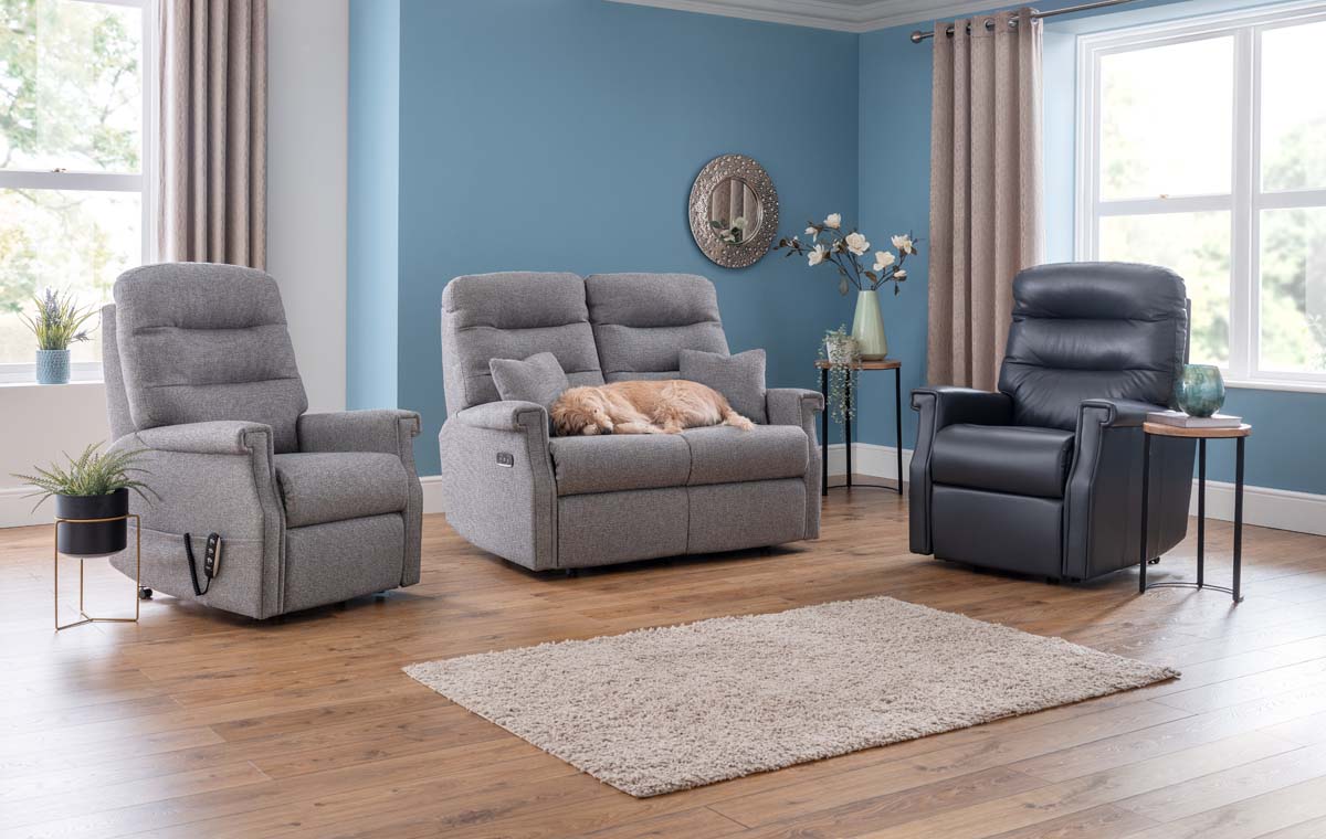 The Sandhurst is a compact, modern and stylish suite with distinctive square arm detailing. All fabric models are fitted with Mammoth Medical Grade™ Foam Seating Technology. All models within the range are available in either fabric or leather. A new innovative design, Cloud Zero 3-motor function is available on riser recliner chairs, this allows for adjustment of the inclination of the entire chair in addition to the dual motor function which offers independent control of the footrest and backrest. All chairs within the range (except legged) are available in 3 sizes: Petite, Standard and Grande.