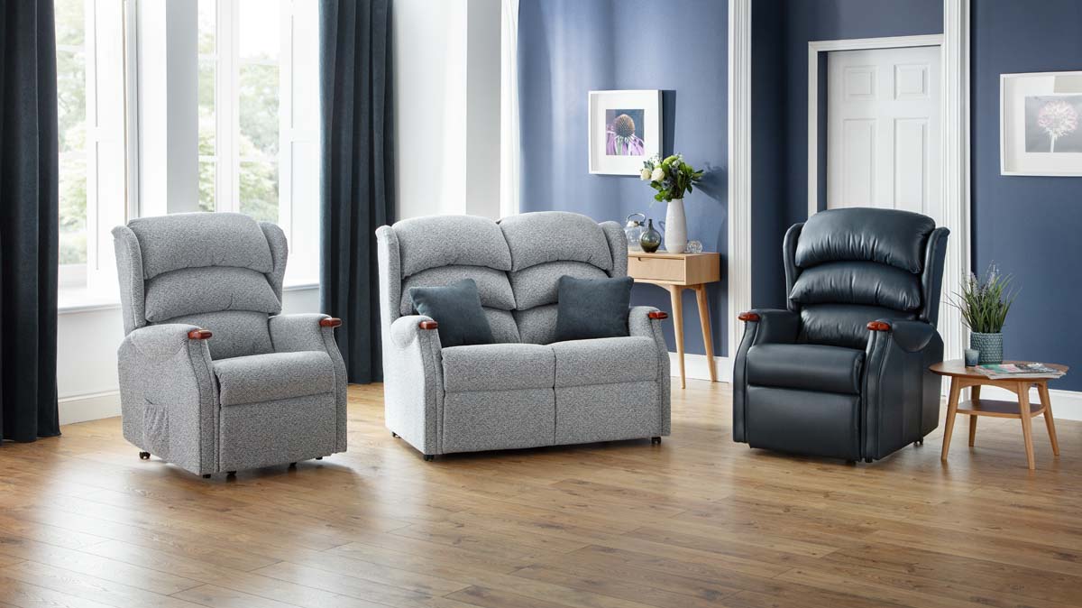 Designed for extra comfort with triple pillow back cushions and a choice of real wood grab handles, the Westbury is a traditional, yet comfortable recliner. Available in Grande, Standard, and Petite sizes, with matching fixed settees. All models are available with or without knuckles in fabric or leather. Please note, Cloud Zero motor function is available on power riser recliner models. See motor options for pricing.