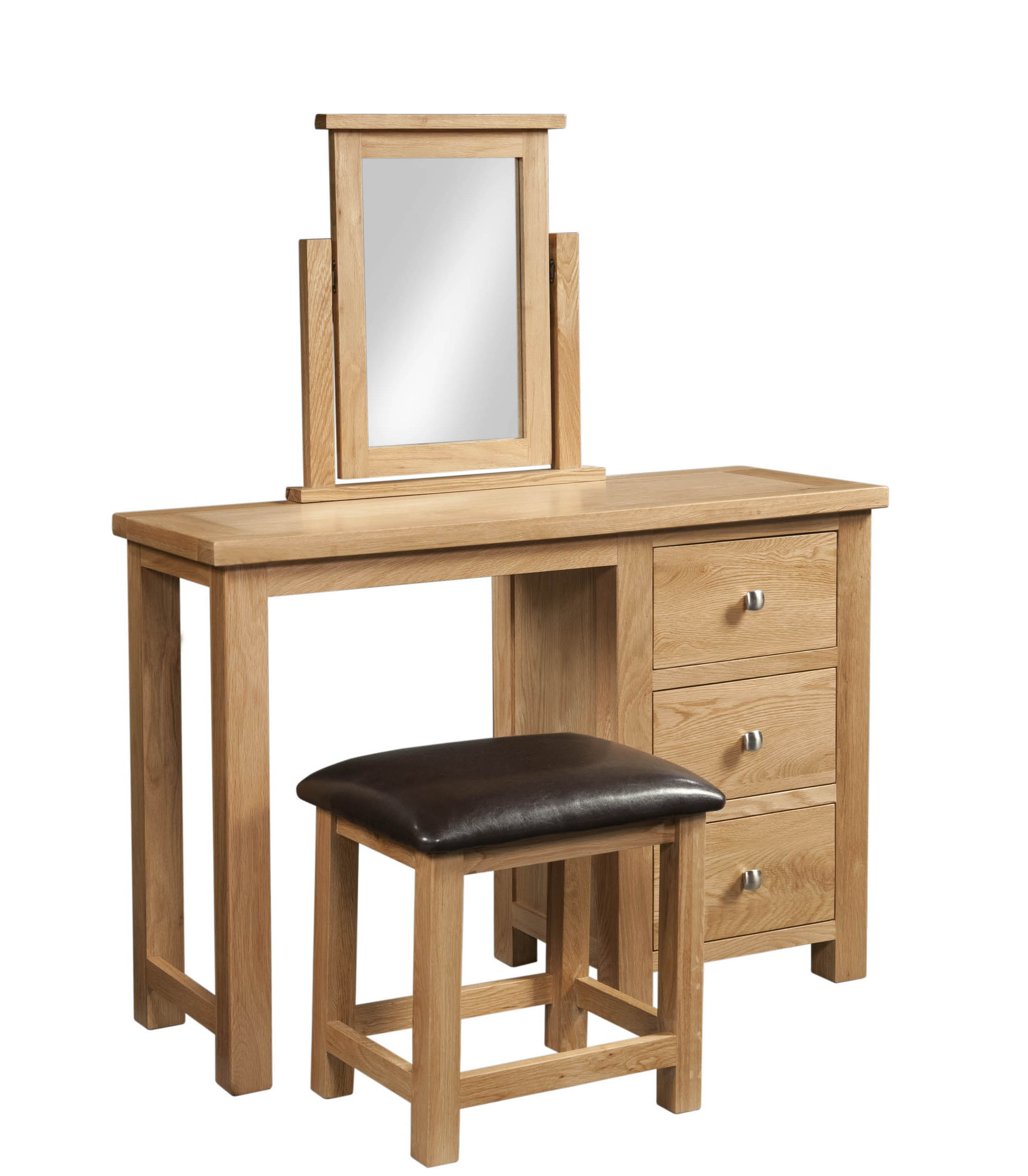 This single pedestal dressing table is durable and stylish, with 3 deep drawers for added storage, and comes with the matching stool with dark leather-effect seat pad.