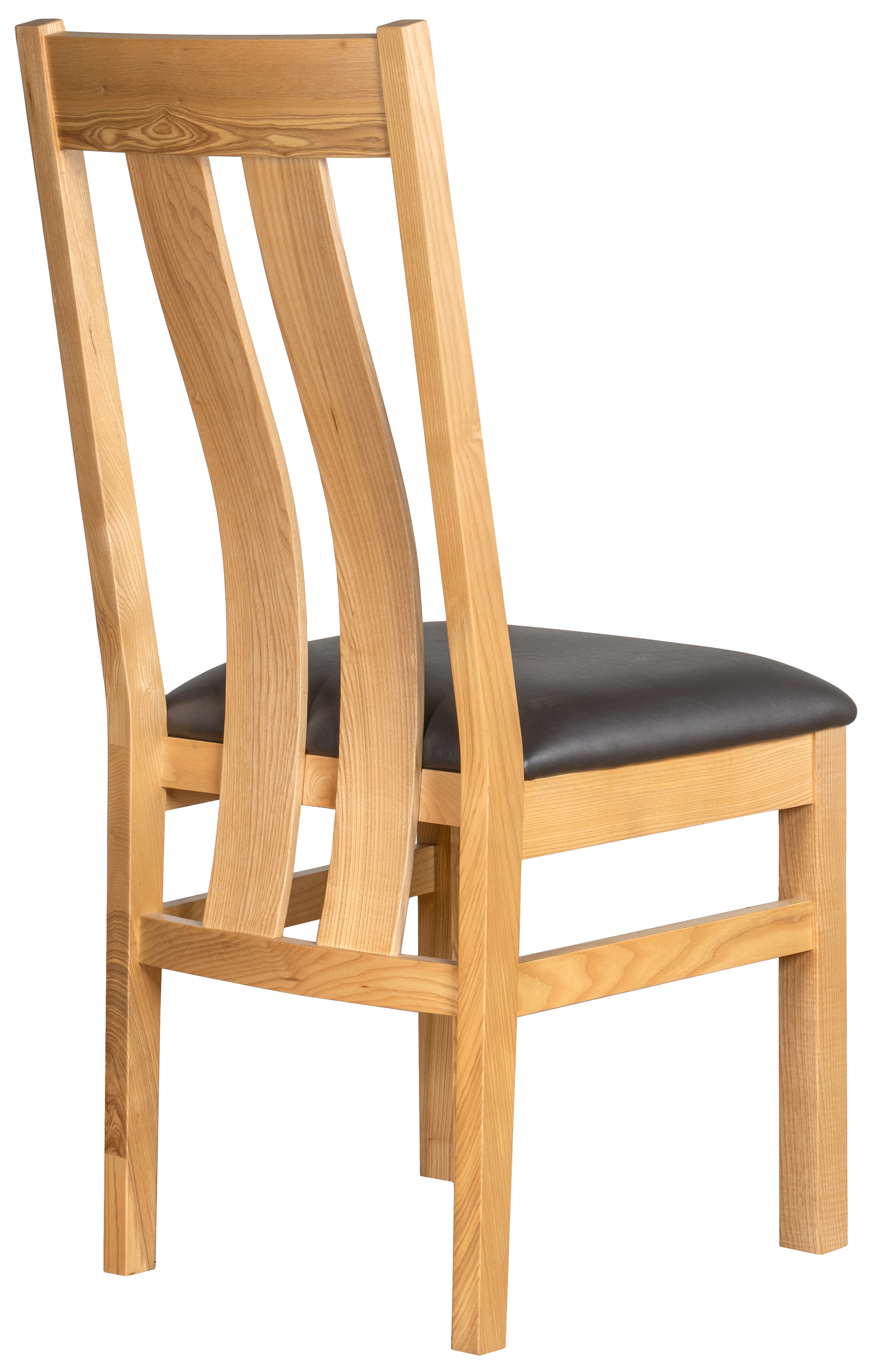 Our most popular dining chair is modern in design with a curved twin slat back for comfort and features a dark brown PU seat pad. This chair matches perfectly with any of our light oak ranges.