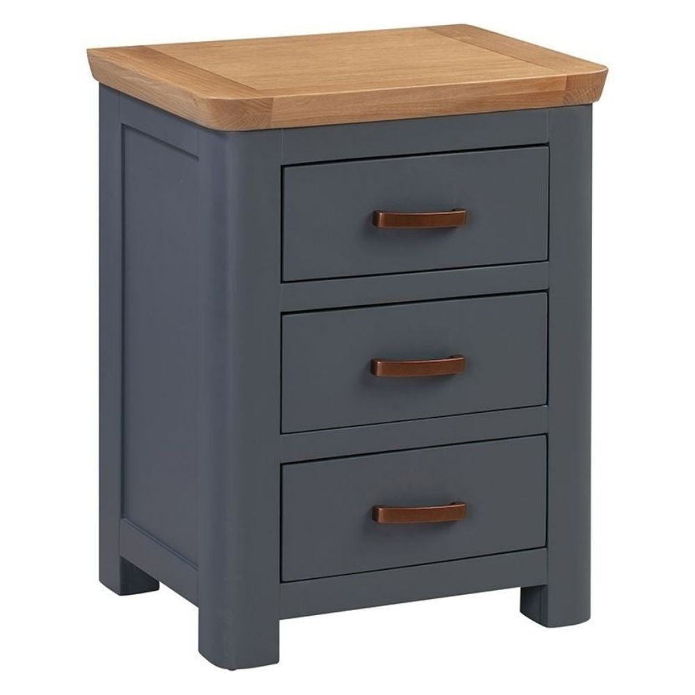 Featuring curved edges and dovetailed joints, along with a midnight blue painted finish and a natural oak top, this collection exudes a refreshing and modern.